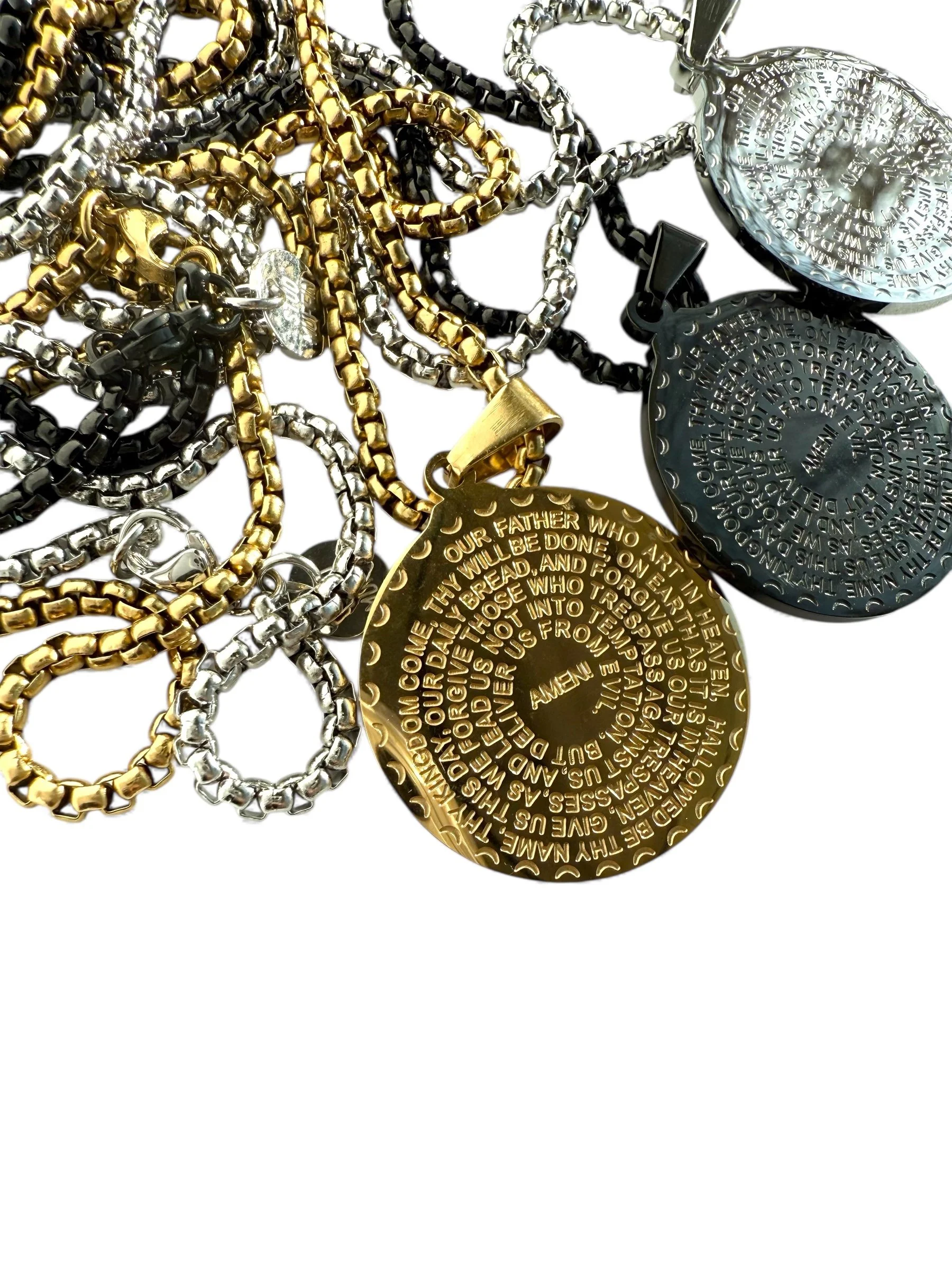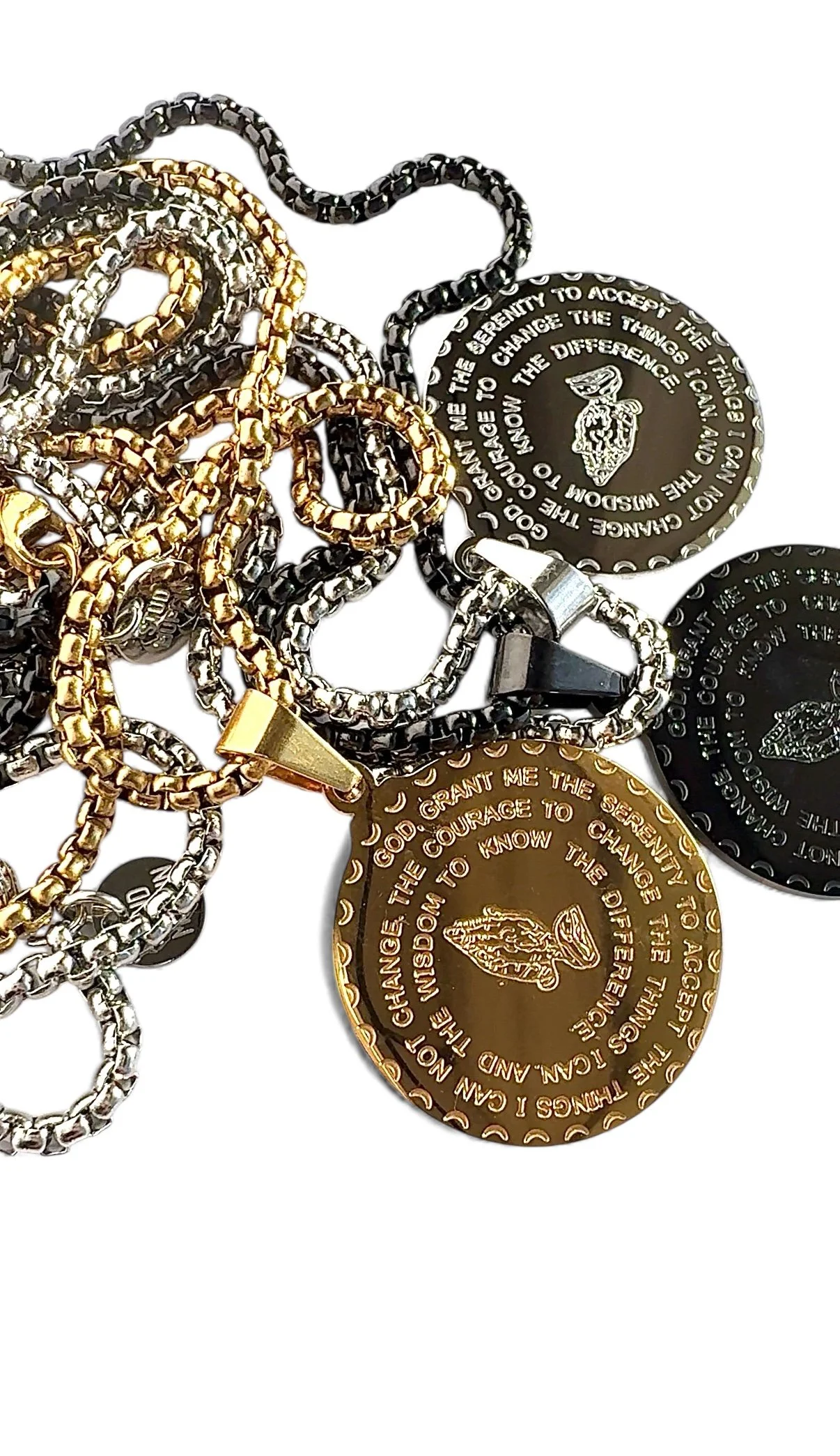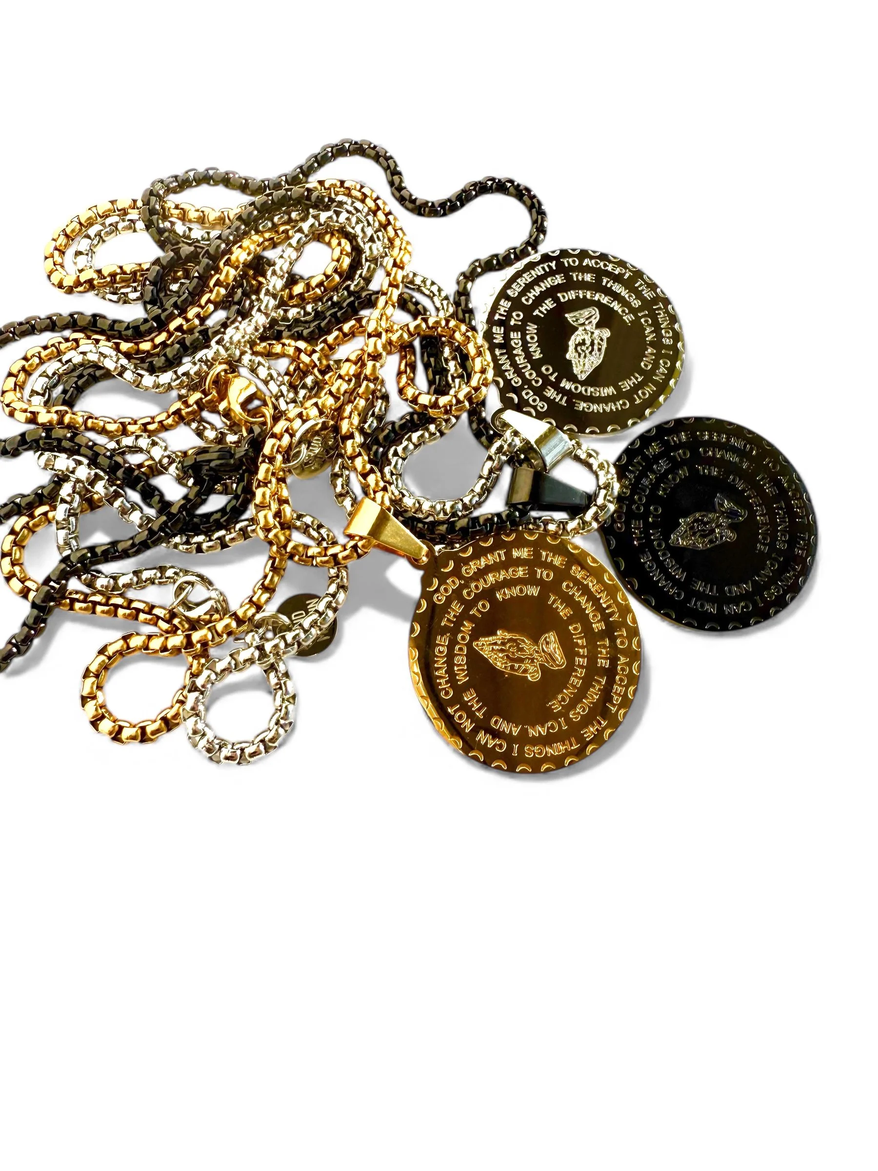 Pendant: gold, silver or black double-sided medal (one side has the Serenity Prayer on it with praying hands and the other side has the Our Father)